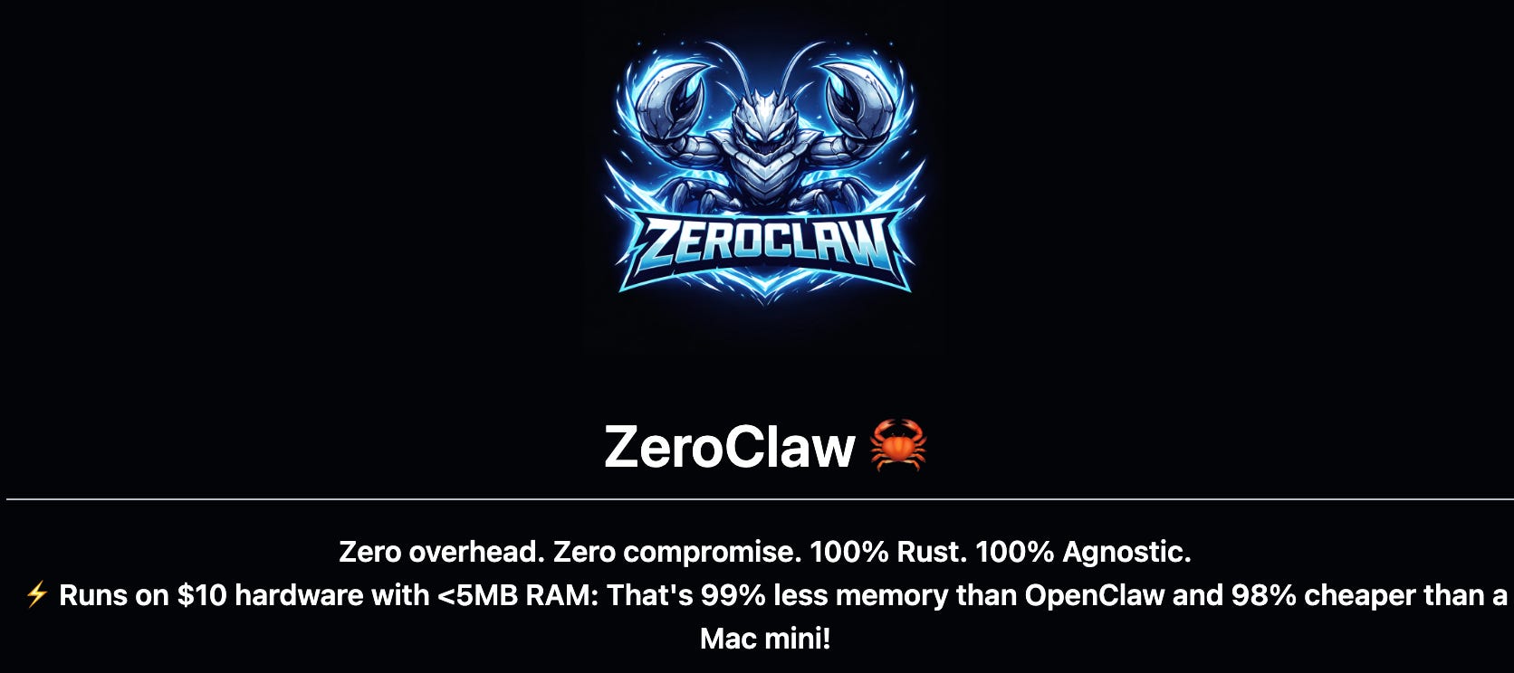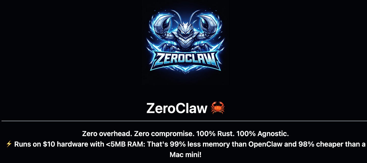This week we are featuring ZeroClaw. It is a runtime operating system for agentic workflows. It abstracts models, tools, memory, and execution so agents can be built once and run anywhere. It can run on low cost hardware. It is far lighter than many other agent runtimes. Check the ZeroClaw GitHub repo for details.