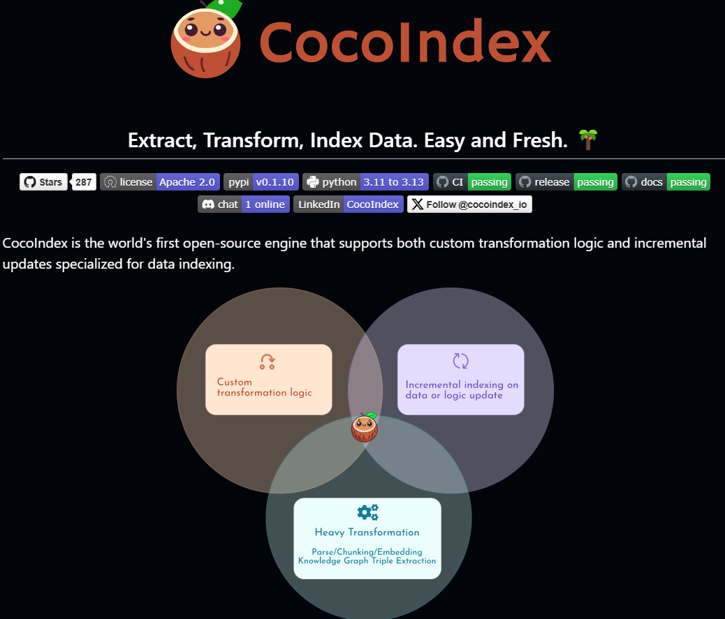 CocoIndex is an open-source data indexing platform built for AI applications. In a typical RAG pipeline, indexing, embedding, and chunking can be time consuming. CocoIndex simplifies this by handling all your data related tasks like connecting data sources, choosing the right indexing strategy, chunking and embedding. It then provides a standard API for accessing index. That way, you can focus on building AI solutions rather than dealing with data tasks. Check out the GitHub repo for more details.