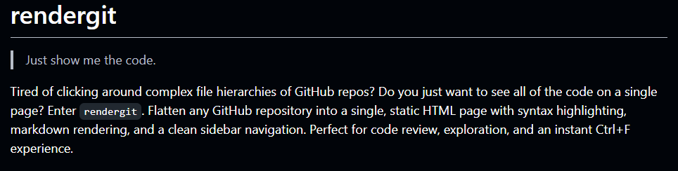 This week we are featuring rendergit, a tool that shows any GitHub repo as a single HTML page. It gives syntax highlighting, markdown rendering, and an option to copy the entire codebase for AI analysis. Perfect for quick code review or a fast Ctrl+F. Check the GitHub repo to try it out.