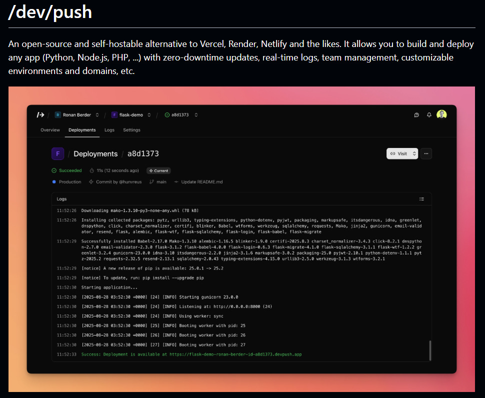This week we’re featuring DevPush, a self-hosted open-source alternative to Vercel and Netlify. You install it on your server, connect your GitHub repos, and when you push code, it automatically builds and deploys your apps with zero downtime. It works with Python, Node.js, PHP, or anything that runs on Docker. Check the DevPush Github repo for more details.
