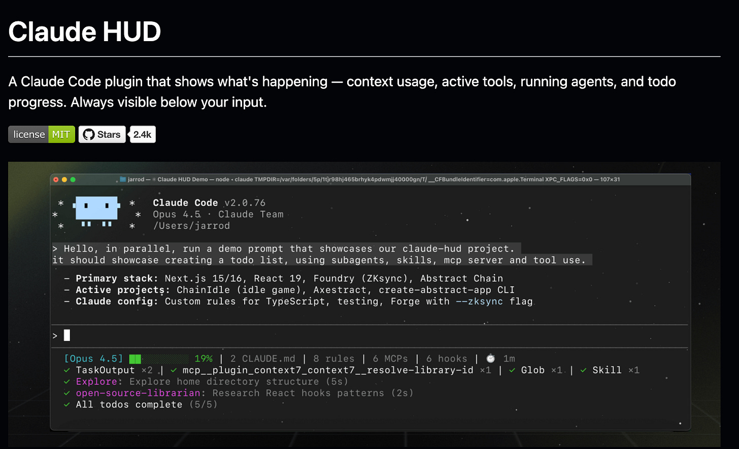 This week we are featuring Claude HUD. It is a Claude Code plugin that shows what is happening while Claude runs. It displays context usage, active tools, running agents, and todo progress right below your input. Check the Claude HUD GitHub repo to know more.