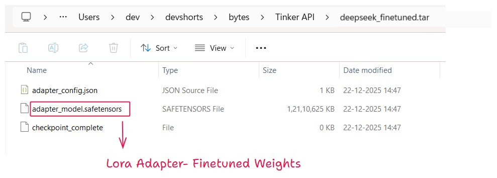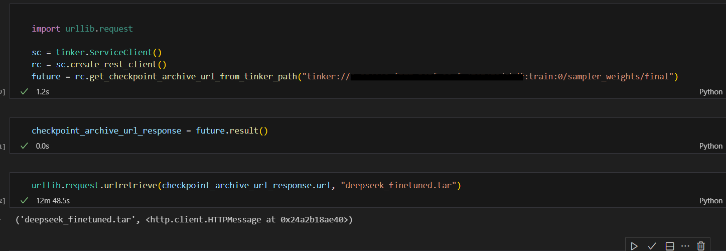 urllib.request.urlretrieve(checkpoint_archive_url_response.url, "deepseek_finetuned.tar")We tested the fine-tuned model using Tinker. Now let us see how to use the fine-tuned weights outside Tinker.