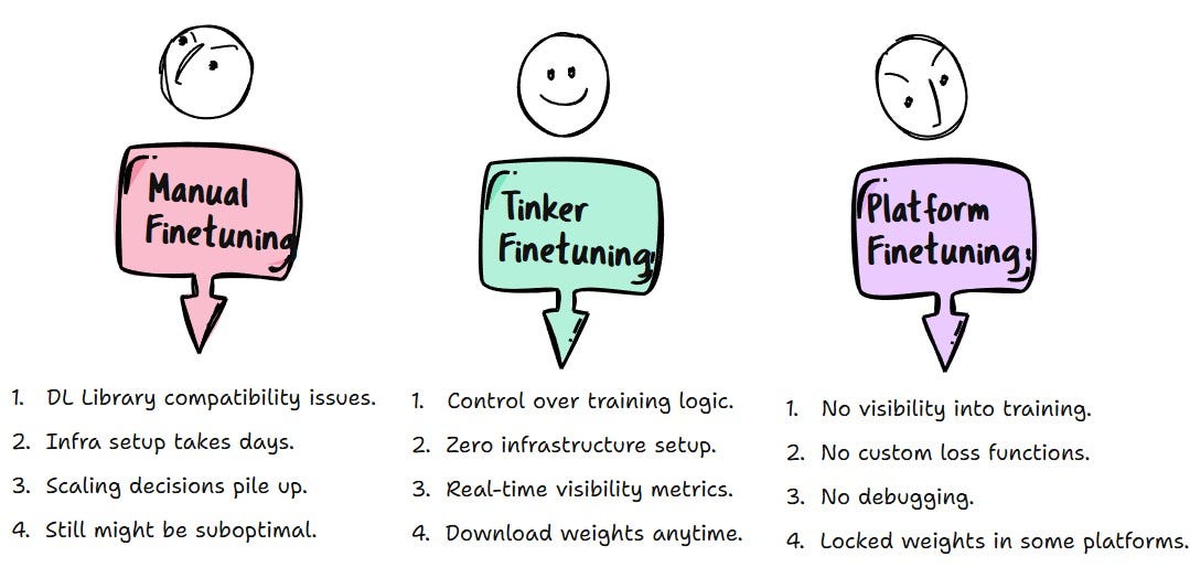 Tinker fits in the right sweet spot between Manual Finetuning and Platform based Finetuning. It gives you control where it matters.