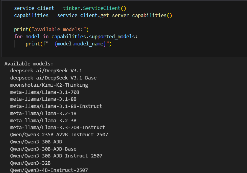 from tinker_cookbook.supervised.common import compute_mean_nllStep 4: Connect to Tinker and see available models: