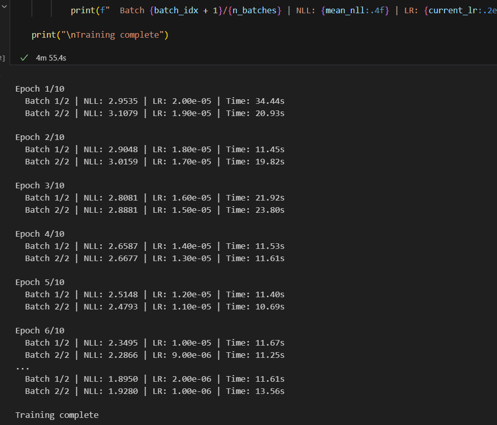 print(f" Batch {batch_idx + 1}/{n_batches} | NLL: {mean_nll:.4f} | LR: {current_lr:.2e} | Time: {elapsed:.2f}s")