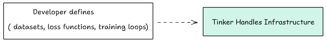 You define the datasets, loss functions, and training loops. Tinker handles the infrastructure headache like GPU setup, Distributed training, Memory management and Hardware failures.