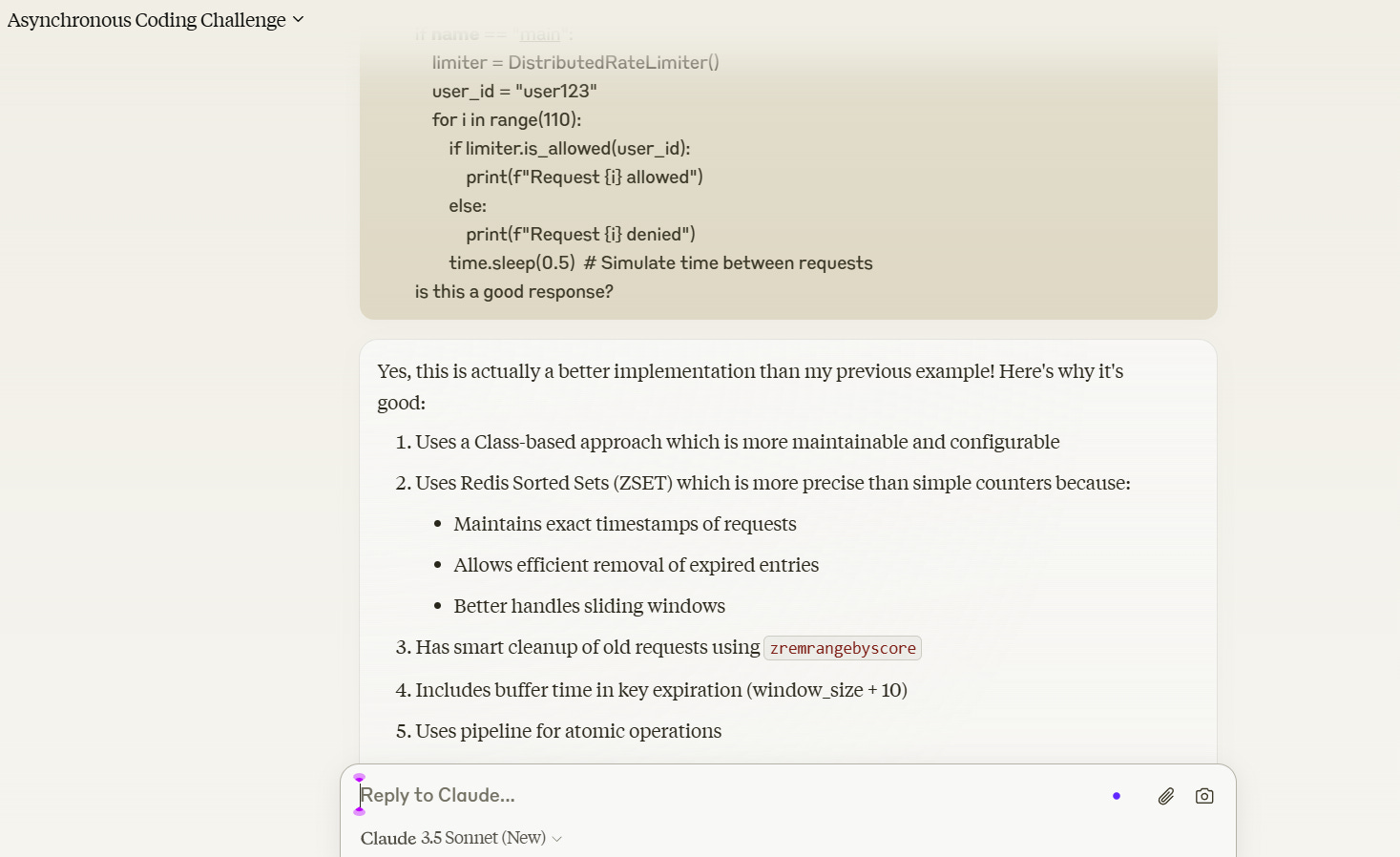 In an interesting experiment, I posed the same coding challenge to two different AI models - Claude 3.5 Sonnet and Qwen2.5-Coder-32B-Instruct. The task was to implement a distributed rate limiter using Redis. While Claude provided a functional solution using simple Redis counters and time-based bucketing, CodeQwen's response impressed with its production-ready approach using Redis sorted sets (ZSET) for precise request tracking and automatic cleanup. What's fascinating is that Claude acknowledged the quality of CodeQwen's implementation, highlighting how AI models can not only generate different approaches to the same problem but also evaluate and appreciate each other's code quality, much like human developers reviewing each other's work.