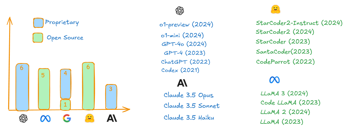 This overview presents the evolution of code models from various providers. OpenAI, Hugging Face, Meta, and Anthropic have developed models designed to assist with code generation and other tasks like code completion, code translation, etc... For the most up-to-date rankings of code generation models, visit the Hugging Face leaderboard. These models illustrate the increasing focus on enhancing coding capabilities through AI.