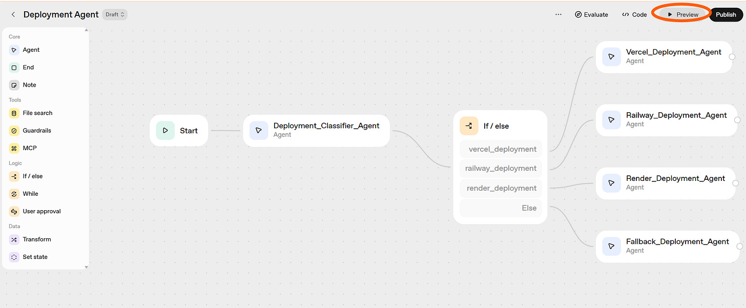 Once the workflow is ready, we can test it using the built in chat interface. Click Preview and send a real input to see how the agent responds.