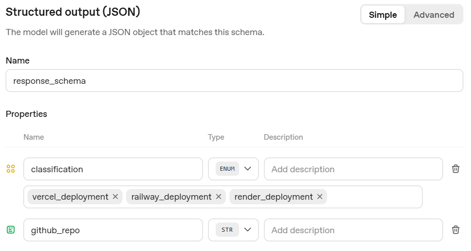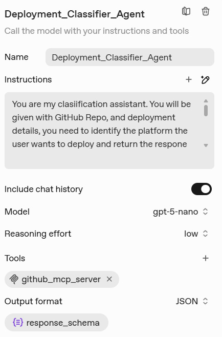 The workflow starts with a Start node. Add an Agent node next to it and name it Deployment Classifier Agent. This agent reads the user input and classifies the deployment target. It returns a JSON with two fields, the GitHub repo and the target platform. Here is the configuration.