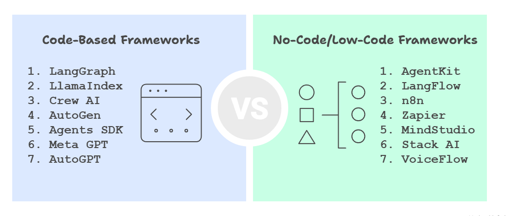 As a result, many new agent frameworks are appearing. Some frameworks are code-based. You write code to build agents. LangGraph, CrewAI, AutoGen are some of the code-based frameworks.