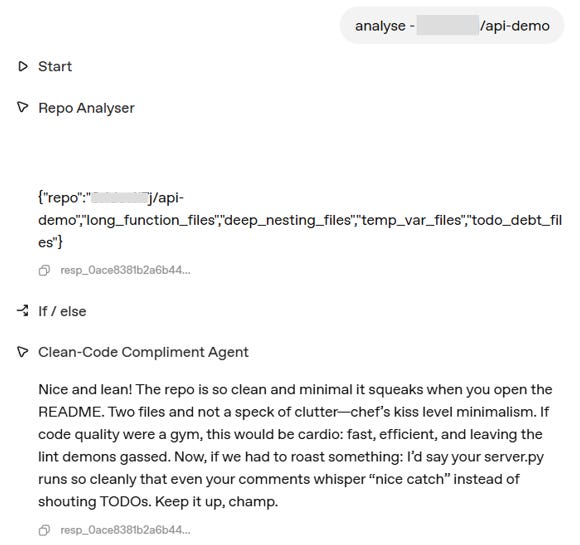 I also built a Code Roaster Agent to test more features. It checks a GitHub repo, finds code smells, and gives a fun roast with quick fix ideas.