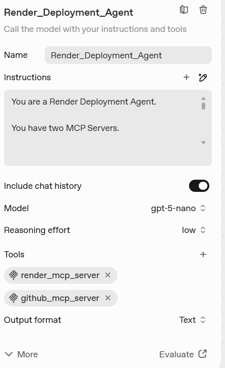 Here is the sample configuration for the Render Deployment Agent. Remember to add detailed instructions for every agent to perform tasks.