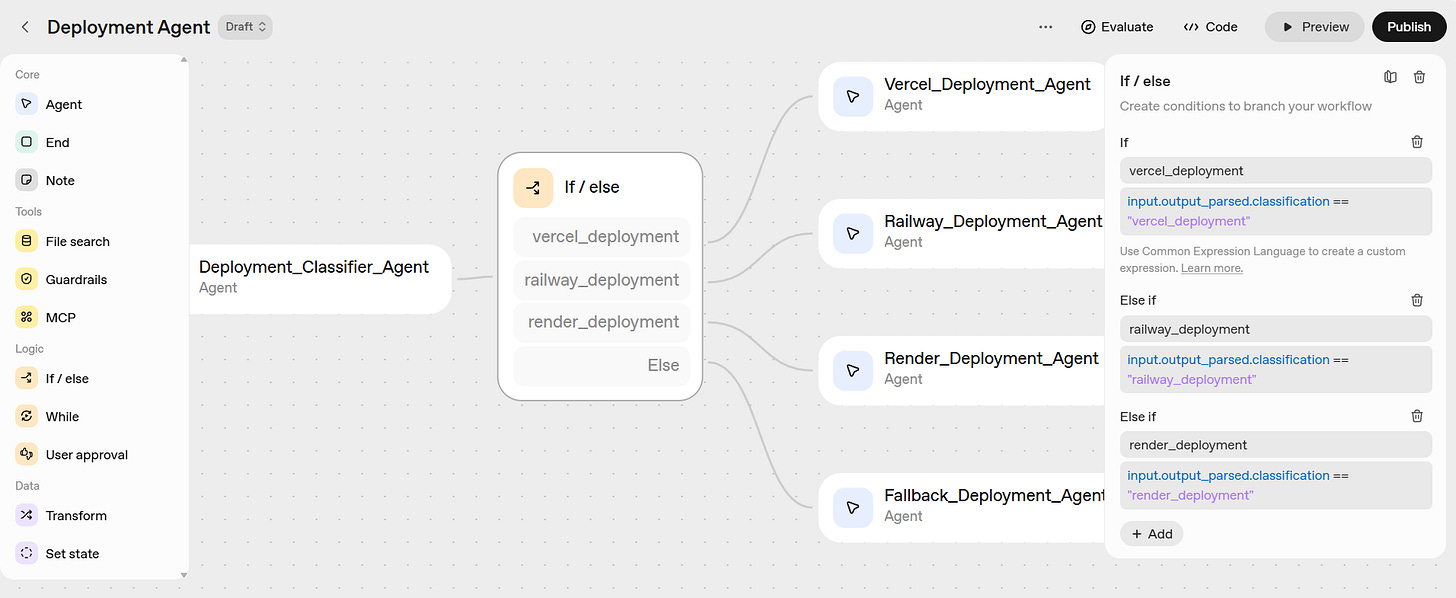 Now add an If / else node after the Deployment Classifier Agent. This node checks the output from the classifier. Based on the classification value, it sends the flow to the correct deployment agent.