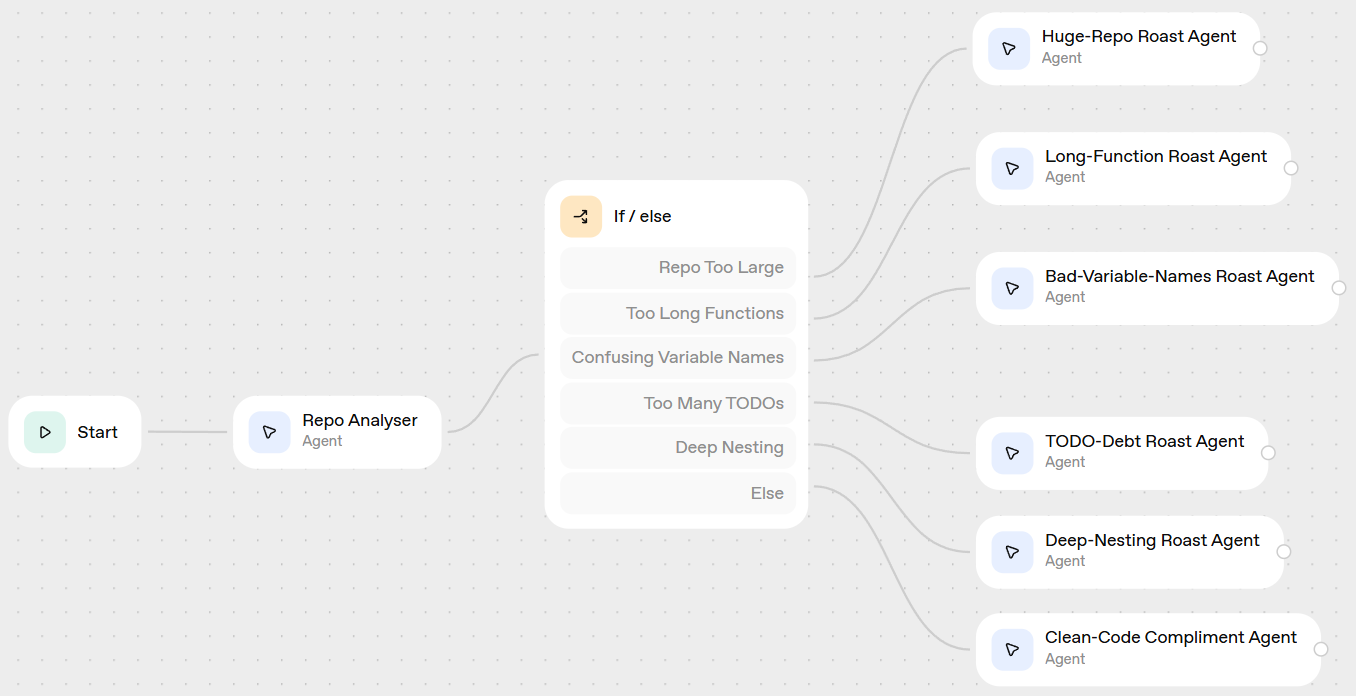 Here is the workflow. The Repo Analyser Agent detects code issues and the If Else node routes it to the correct roast agent.