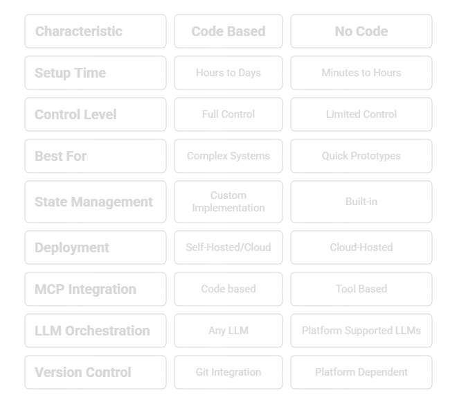 No code frameworks provide visual tools where we drag and drop blocks to create the workflow. They are faster to begin with, and we can build agents in minutes. They offer less control for advanced logic, but they are great for quick automation.